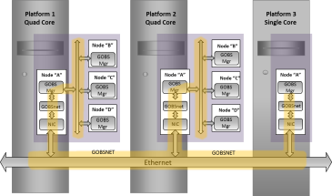 With processes on each node communicating in a managed way via GOBSnet, several applications running on different nodes and different hosts can work together as a system. For this to occur, nodes must be detectable by other nodes and identifiable via a unique name.