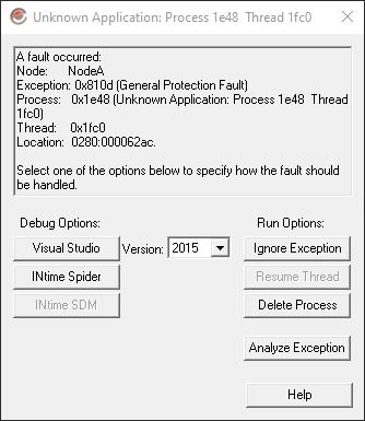 On INtime Distributed RTOS when an unhandled fault occurs the DSM prints a message on the console about the process and thread which faulted, and the faulting address.
