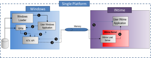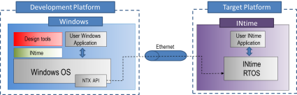 Note that the INtime for Windows and INtime Distributed RTOS development environments are identical except for the INtime Distributed RTOS having the Windows and the INtime components running on separate platforms connected via Ethernet. Because of those similarities it is possible to develop stand-alone INtime application with an INtime for Windows configuration setup and then move the application to target platform.