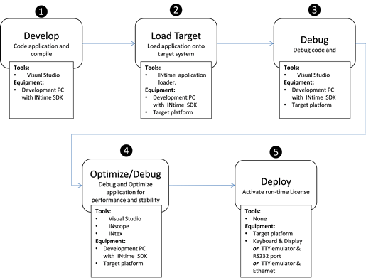 The INtime SDK provides the environment needed to create and run real-time (RT) applications and download them to a target system. The next figure shows development stages and tools used during each phase.
