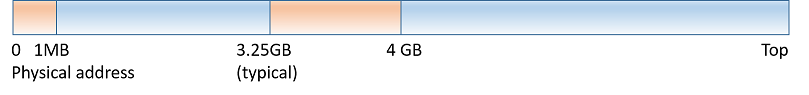 The following diagram illustrates the memory map of a typical PC system. Certain address ranges (colored orange) are reserved for I/O and firmware, with RAM accessible in the other ranges.