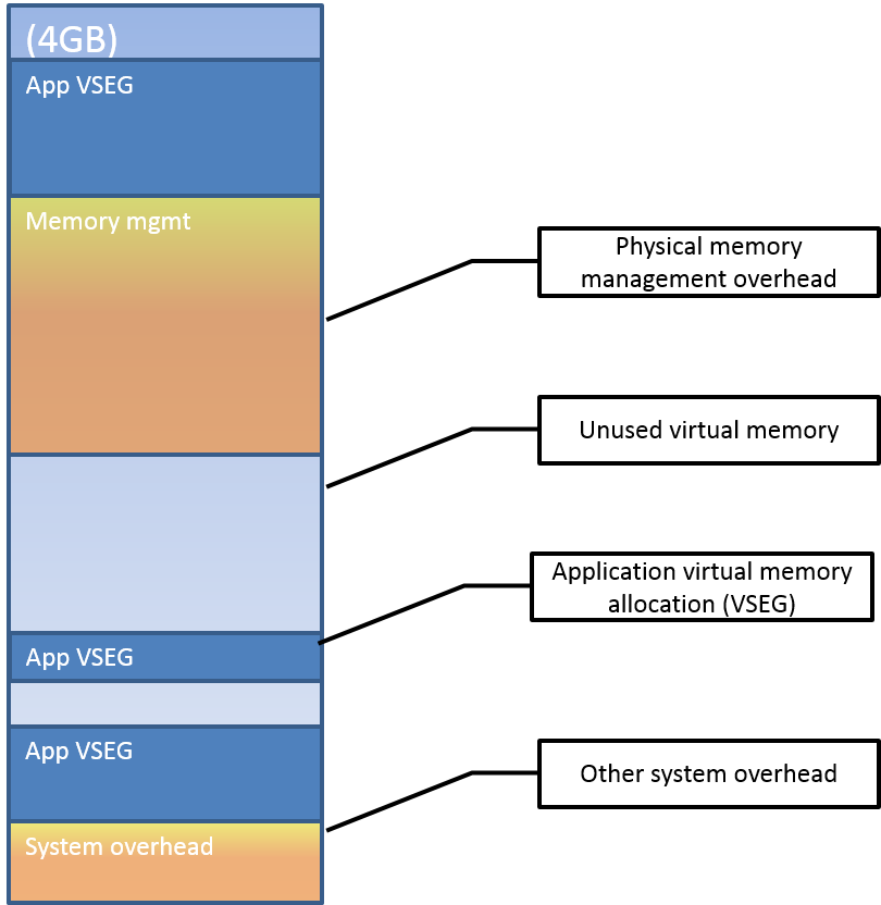 This figure shows how the 4 GB of virtual memory space is divided between the various system overheads and to create VSEGs for applications.