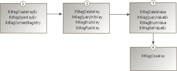 This shows the order to make registry system calls and lists calls that registers and their keys frequently use: