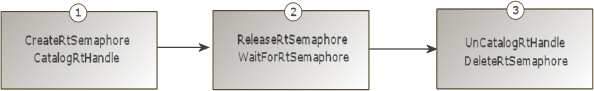 Wait for a unit from a semaphore with knWaitForRtSemaphore. You must repeat the call for each unit you need. If the semaphore contains units, the unit count decrements by one and the thread proceeds. If the semaphore has no units and the thread can wait, the thread goes to sleep in the semaphore's thread queue. Release a unit to a semaphore with knReleaseRtSemaphore. If threads wait at the semaphore, the thread at the head of the queue awakens.
