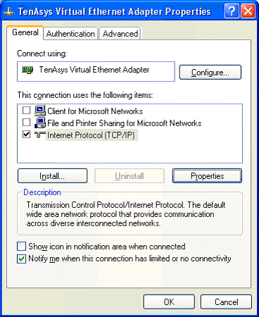 Note: The virtual adapter's property page can be accessed by locating the TenAsys Virtual Ethernet Adapter in the Windows device manager tree.