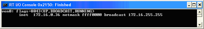 We can determine the INtime interface IP address by running the INtime ifconfig.rta utility on the INtime kernel. In the example below we do this by using the INtime "piperta" command from DOS prompt. The IP address is displayed after "inet", in this example, it is "172.16.0.36".