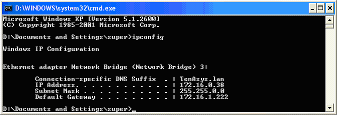 In this configuration the IP addresses are unknown until we query the interfaces. Since we have configured the Windows interfaces to be bridged, we can use the bridge address. We obtain the bridge address, in this example it is "172.16.0.38", with the Windows ipconfig command: