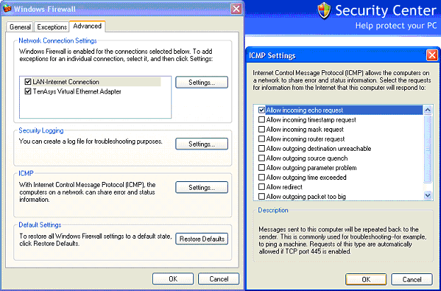 If you are using Windows XP with Service Pack 2 you must allow the ICMP request from the Windows Security Center from the control panel. Go to the advanced tab, and select the ICMP settings, then check the "Allow incoming echo request". If you have a third party Firewall installed on your machine, you may need to also change its setting to allow the incoming ICMP request.