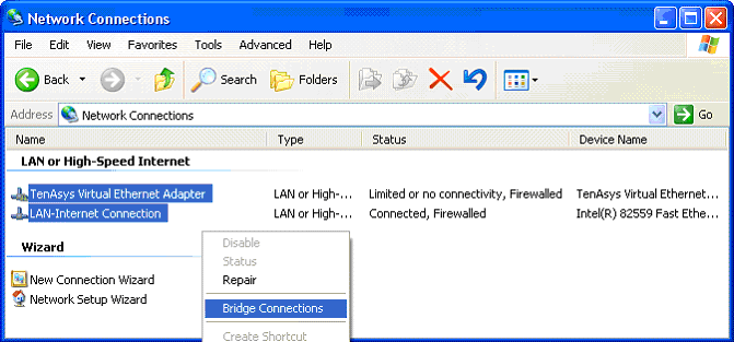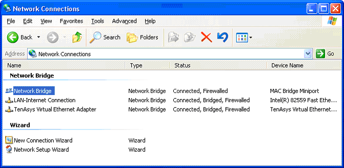 It is also possible to create a bridge between two or more adapters on the INtime network stack. You might want to do this, for example, if:
