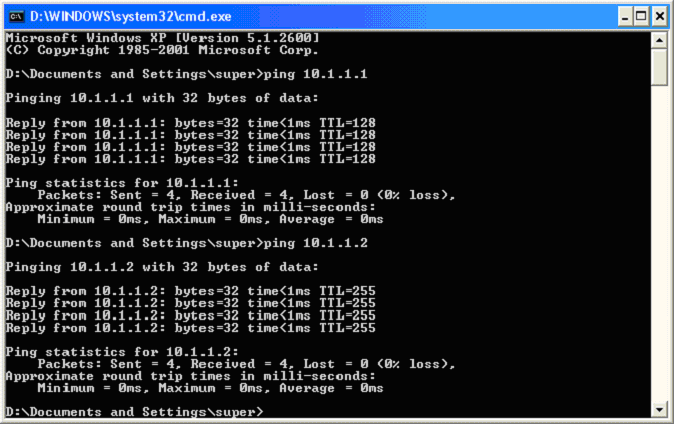 In this configuration we know the address for the Windows and INtime interfaces; 10.1.1.1 and 10.1.1.2, respectively. We will ping the interfaces at the known IP addresses to verify the configuration.