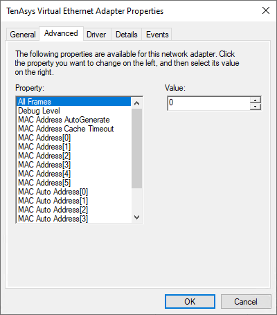 Windows side MAC address can be configured in "TenAsys Virtual Ethernet Adapter Properties" dialog box. The Windows side of the Virtual Ethernet driver uses the MAC address exactly as specified in the Properties dialog box. Even though it is possible to select any MAC address in the Properties dialog box, it is strongly recommended that the last octet of the Windows side MAC address is left as 0xff (or 255 in decimal, as seen in the Properties dialog). The reason is detailed in the next section.